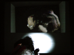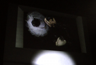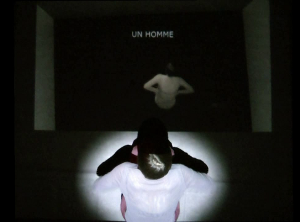 S'il sort du cercle, elle s'arrête.. ![]() Dans les vidéos enregistrées, les représentations du corps sont dédoublées, nu et habillé, masculin et féminin, ces deux éventualités étant tirées au hasard. Cependant chaque séquence ne présente qu'un seul et même comédien, tiré également au sort parmi les onze participants. C'est ainsi deux fois le même corps, nu et vêtu, qui est mêlé au spectateur : il n'y a pas de corps sacré. Le tirage au sort permet une grande combinaison de situations (actuellement plus de 40). On ne peut donc pas revenir et revivre exactement ce que l'on a vécu la première fois. Ce qui se passera sera semblable, mais en relation avec un personnage inconnu. ![]() Enfin l'interactivité est assez inhabituelle en comparaison de ce à quoi le public est habitué. C'est comme si elle était inversée et que c'était le personnage filmé qui pouvait agir en poussant le double du spectateur dans l'image en dessous. Le participant est libre de bouger à sa guise, mais il ne peut modifier l'apparence des films enregistrés ![]() |