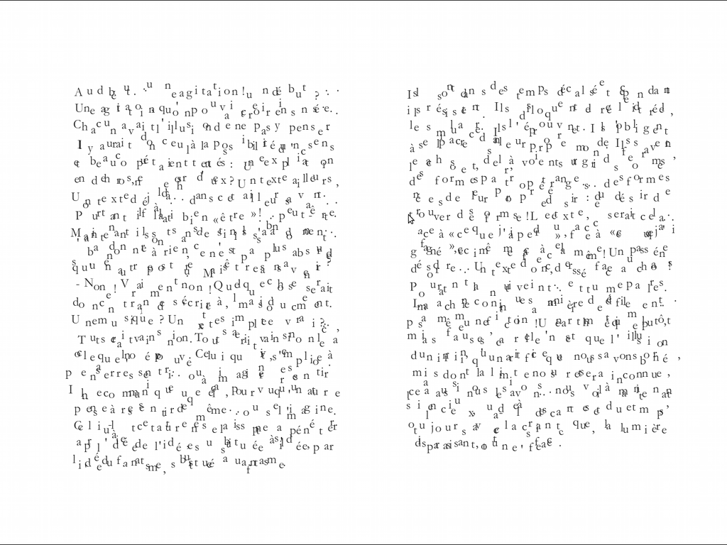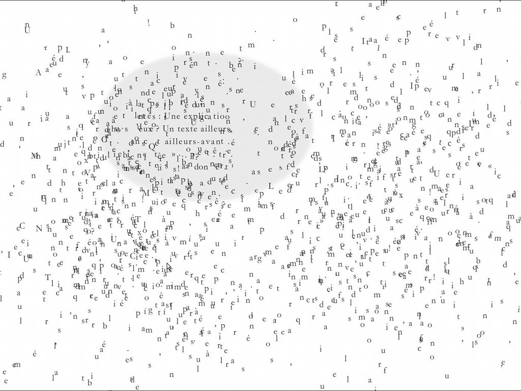 ![]() Vidéo interactive, 2007-2012 Durée approximative 4mn A l'écran : un texte dont la disposition sur la page a été brouillée, le rendant illisible et mouvant. Seul le regard des spectateurs présents en permet la lente recomposition jusqu'à ce qu'il devienne à nouveau lisible. Sans ces regards, le texte se brouille à nouveau. ![]() ![]() ![]() |