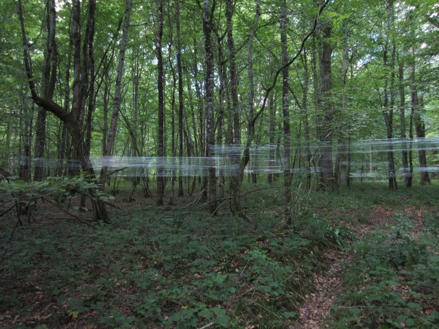 2011Exposition invisible, Aubepierre sur Aube, Haute-Marne Dans le cadre de D'abord les forêts, opus 2, à la Maison Laurentine En utilisant un matériau peu visible, surtout dans la pénombre, mais qui capte la lumière, là ou il plisse, on trace dans la forêt des rais de lumières horizontaux comme si les arbres étaient interconnectés. L'espace des relations entre arbres est ainsi rendu visible ; c'est l'espace dual par analogie au sens mathématique du terme. En mathématiques, l'espace dual d'un espace vectoriel E est l'ensemble des formes linéaires sur E. Il existe un isomorphisme canonique entre un espace euclidien et son dual. Wikipedia |