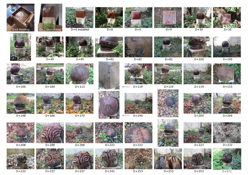 une expérience commencée en Juin 2011 et toujours en coursPierre calcaire, colle d'os Il s'agit ici d'observer sur le long terme les transformations formelles d'un cube en matériau biologique posé sur un support minéral aux même dimensions. |