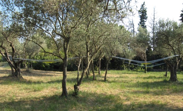 d'olivier, 2011Chapelle Saint-Gabriel, Tarascon, Bouches-du-Rhône Film polyéthylène et huile d'olive Dimensions approximatives de la zone d'implantation 60 m x 40m Le site est vraiment très beau avec sa chapelle romane, son champ d'olivier en déshérence, et une ancienne carrière à l'arrière du champ. L'installation met en œuvre des fuseaux de film étirable contenant de l'huile d'olive en contrechamp d'une oliveraie. L'huile est comme suspendue entre les arbres, comme si elle en provenait directement. Commissaires : Christine Blanchet, Leïla Voight |